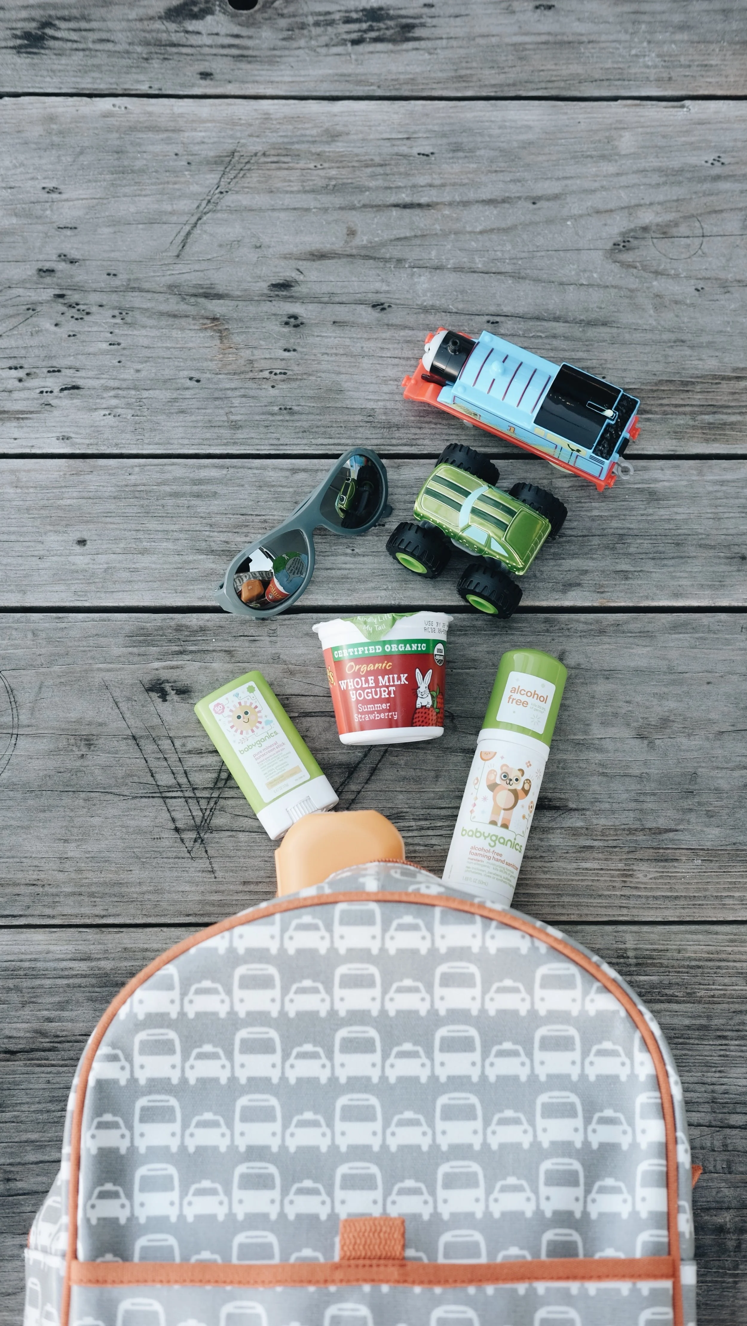 "Whenever we go out, we always ensure that we bring Ollie's backpack full of the essentials. This Dwell Studio for Thermos backpack is great for many reasons. It is insulated, easy to clean, sturdy, and the cute print is perfect because Ollie is obsessed with transportation, or basically anything with wheels on it! Sun protection is a must. We like Babyganics sunblock stick because it's handy, not messy, and easy to use. Ollie has sensitive eyes and he likes to copy me when I wear my sunglasses. The Babiators are perfect for protecting his eyes and for matching with "mommy". We also never leave home without a travel first aid kit (by MediBuddy in the orange container), a yummy snack, and toys to entertain him. Of course the toys of choice lately are trains and cars, particularly Thomas the Tank Engine."